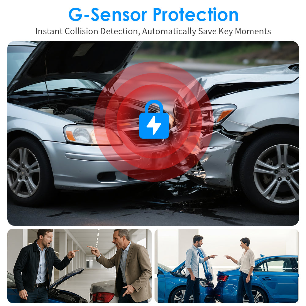 When emergency collision occurs, dash camera will automatocally start to record and lock the video. Emergency videos are stored in a separate folder, ensuring they won't be overwritten by regular videos. Provides crucial evidence in case of accidents to resolve disputes effectively.